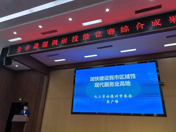 11月4日,在由中共德州市委市直机关工委、德州市总工会主办的“全市‘守初心强素质,担使命立新功’课题调研技能竞赛综合成果展示会”上,九三学社德州市委委员、直属四支社主委、参政议政专委会主任、武城县政协委员活动室副主任吴广峰代表九三学社德州市委作了题为《加快建设德州市区域性现代服务业高地》的调研成果展示,获得评委和观众好评,并获一等奖。(九三学社德州市委)
