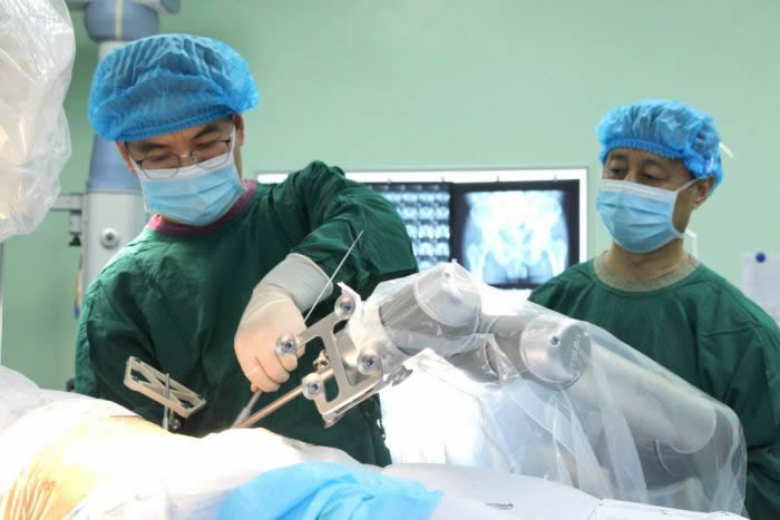 (陈洪杰主任用手术机器人进行手术)