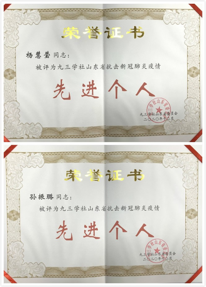 孙振璐、杨慧莹荣获九三学社山东省抗击新冠肺炎疫情先进个人称号。