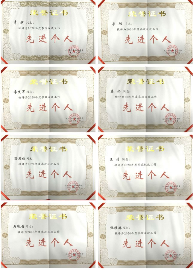 王清、秦松、李斌、孙英钦、李文军、李胜、吴晓青、张桂德等8名社员荣获九三学社山东省2020年度参政议政工作先进个人称号。