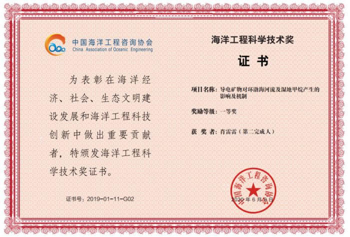 近日,九三学社烟台市社员肖雷雷作为第二完成人申报的“导电矿物对环渤海河流及湿地甲烷产生的影响及机制”获海洋工程科学技术奖一等奖。海洋工程科学技术奖是中国海洋工程咨询协会根据《国家科学技术奖励条例》和《社会力量设立科学技术奖管理办法》的规定,经科技部登记核准而设立的全国第一个海洋工程领域的最高科学技术奖项。