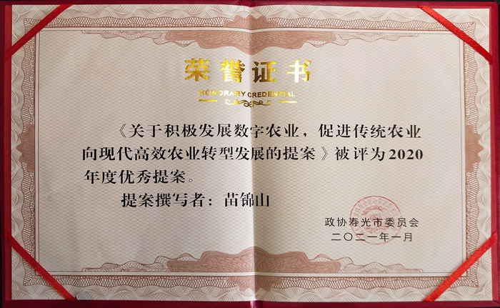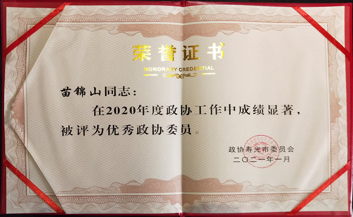 会议期间,寿光市政协表彰十届四次会议以来的优秀政协委员和优秀提案,苗锦山在寿光市政协常委履职考核中以总成绩185分位列第一名,被评为优秀政协委员,其提交的《关于积极发展数字农业,促进传统农业向现代高效农业转型发展的建议》被评为2020年度优秀提案。(九三学社潍坊市委)