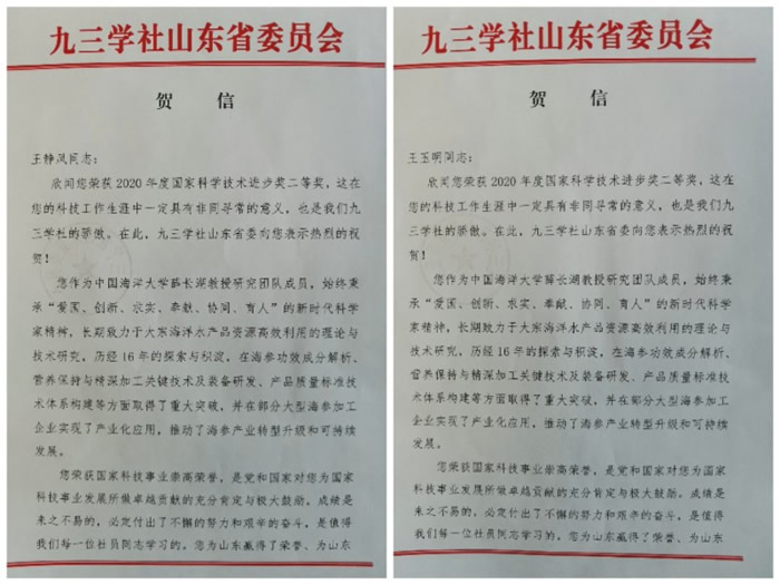 日前,九三学社山东省委分别致贺信向荣获2020年度国家科学技术进步奖二等奖的王静凤、王玉明两位九三学社社员表示热烈祝贺。 贺信中说,两位社员作为中国海洋大学薛长湖教授研究团队成员,始终秉承该“爱国、创新、求实、奉献、协同、育人”的新时代科学家精神,长期致力于大宗海洋水产品资源高效利用的理论与技术研究,历经16年的探索与积淀,在海参功效成分解析、营养保持与精深加工关键技术及装备研发、产品质量标准技术体系构建等方面取得了重大突破,并在部分大型海参加工企业实现了产业化应用,推动了海参产业转型升级和可持续发展。 贺信指出,这次荣获国家科学技术奖在他们个人科技工作生涯中具有非同寻常意义,是九三学社的骄傲,也是山东九三的骄傲。他们在本职工作中付出了不懈的努力和艰辛的奋斗,做出了卓越的贡献,值得每一位社员同志学习。希望两位获得奖励的社员在以后的工作中,继续弘扬九三学社爱国民主科学的优良传统,在科学技术领域锐意进取、勇攀高峰,再创佳绩,为我国自主创新与科技发展,为中国共产党领导的多党合作事业和九三学社的发展做出新的贡献。(社省委 陈建华) |