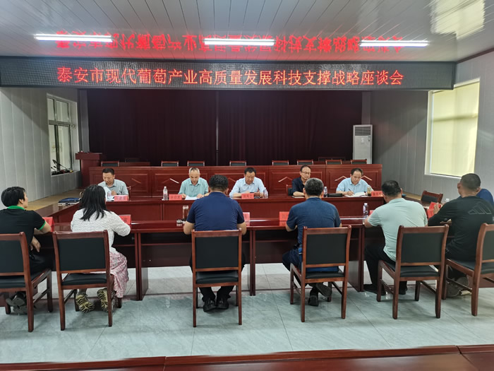随后召开泰安市现代葡萄产业高质量发展科技支撑战略座谈会。会上,基地负责人汇报了葡萄产业发展现状与存在问题,刘凤之、王金政系统全面地审视泰安市现代葡萄高质量发展的历史、现状与存在问题,从管理模式、培优品种、做好品牌等方面提出了发展意见、建议和切实有效的解决方案。 6月7日,刘凤之一行先后来到山东康顿农业有限公司、肥城桃都果业有限公司、肥城市壬水木农业有限公司,听取相关情况汇报,现场考察调研了万亩现代桃产业基地、千亩现代苹果基地的果树生长情况,专家组对果树整形修剪、土壤管理、花果管理与品质调控等进行了精准技术指导。
