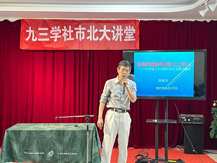 6月17日下午,九三学社青岛市北大讲堂在地处同德路的尚音艺术学校举行,特邀九三学社青岛市委员会社史研究中心主任张俊杰主讲《独领风骚的青岛九三学人》,以此纪念“五一口号”发布七十五周年、庆祝九三学社青岛地方组织成立七十周年。本次活动由社市北区委会主办,社市北区委会青年委及第二支社联合承办,近20位社员参加,社区委会轮值主委门国锋、副主委杨晓梅、委员林晓燕参加。