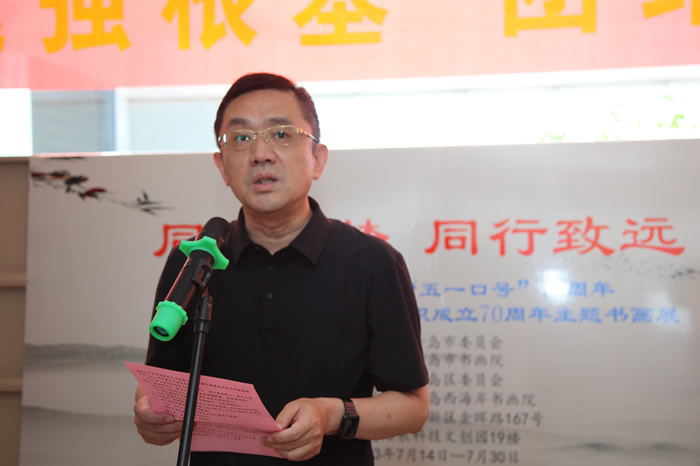 7月14日上午,由九三学社青岛市委会、九三学社青岛市书画院主办;九三学社青岛市黄岛区委会、九三学社青岛西海岸书画院承办的庆祝中共中央发布“五一口号”75周年暨九三学社青岛市地方组织成立70周年书画展在青岛西海岸新区浩辰科技文创园(西海岸新区金晖路167号)隆重举行。
