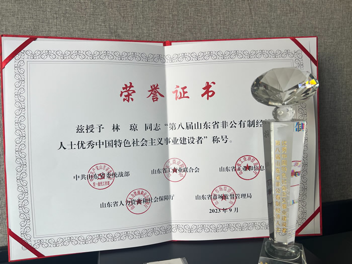 9月14日上午,第八届山东省非公有制经济人士优秀中国特色社会主义事业建设者表彰大会在济南召开,深入贯彻落实习近平总书记关于民营经济发展的重要论述,认真落实党中央、国务院《关于促进民营经济发展壮大的意见》,表彰优秀中国特色社会主义事业建设者,激励广大非公有制经济人士为新时代社会主义现代化强省建设贡献智慧力量。 中共山东省委书记林武会前亲切会见了受表彰人员,省委副书记、省长周乃翔参加会见并在大会上讲话。会上,宣读了表彰通报,决定授予丁木等145名非公有制经济人士和新的社会阶层人士“山东省非公有制经济人士优秀中国特色社会主义事业建设者”称号。九三学社烟台市委会常委、山东智宇律师事务所主任林琼荣誉这一殊荣。