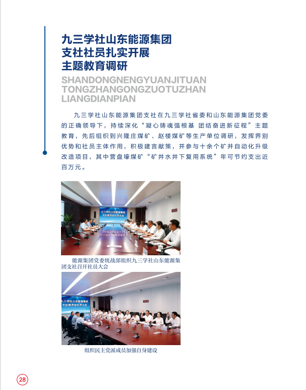 在企业发展中展现九三力量。发挥界别优势和社员主体作用,积极建言献策,经过深入调研,提交的《关于推动经济社会发展绿色转型的意见建议》提案,得到有关部门高度重视和积极反馈。围绕山东能源集团改革发展中心工作,开展“九企”合作,有力有序推进合作协议落实落地。山东能源集团支社作为创新案例,在省属企业统战工作推进会上,作为工作亮点进行了展示。