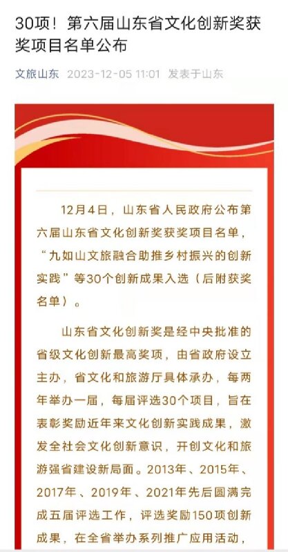 12月4日,山东省人民政府公布第六届山东省文化创新奖获奖项目名单,九三学社社员、聊城大学音乐与舞蹈学院院长尹蕾(首位)团队的“乐动风俗――鲁西黄河音乐公共文化服务创新与实践”项目被山东省人民政府授予“文化创新奖”。 山东省文化创新奖是经中央批准的省级文化创新最高奖项,由省政府设立主办,省文化和旅游厅具体承办,每两年一届,自2009年设立以来已举办六届,每届评选30个项目。旨在表彰奖励近年来文化创新实践成果,激发全社会文化创新意识,开创文化和旅游强省建设新局面。 近年来,聊城大学音乐与舞蹈学院通过艺术实践周、音乐驿站、百场微演走一线、红色文艺轻骑兵等品牌活动致力于传统文化传承与研究,深入开展校地融合,为繁荣地方社会公共文化事业取得了显著成效。 (九三学社聊城市委员会)