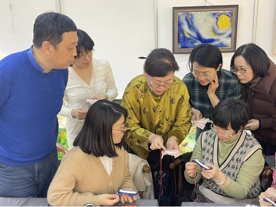 在主题分享环节,市北区政协委员、齐绣非遗传承人黄凤老师给大家分享了齐绣的发展状况。齐绣是一项古老的刺绣技艺,彰显着绣女们的心灵手巧,也是极具青岛特色的非物质文化遗产,近年来复兴势头明显,社会影响力越来越大。现场,黄凤还准备了刺绣所需的材料和器具,手把手指导大家动手操作,穿针引线间,大家感受到齐绣艺术的精美以及文化传承的不易。