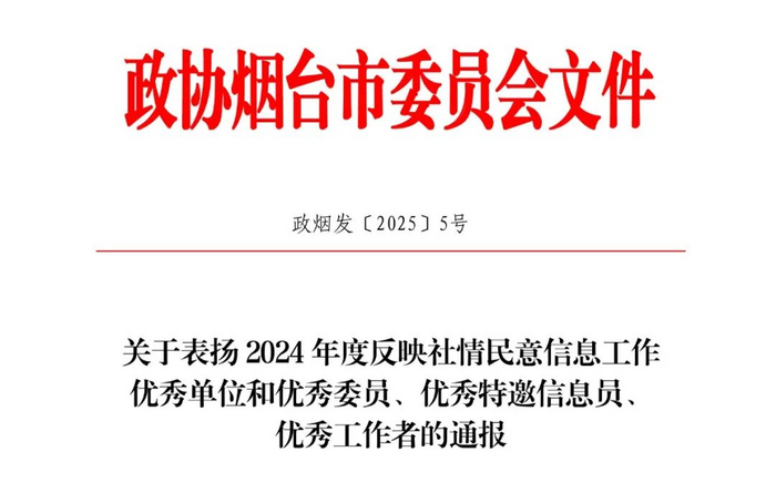 近日,烟台市政协印发《关于表扬2024年度反映社情民意信息工作优秀单位和优秀委员、优秀特邀信息员、优秀工作者的通报》,对19个有关单位和王传远等25名政协委员、8名特邀信息员、18名工作者进行通报表扬。