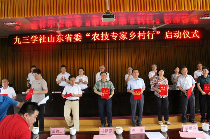 程林主委为“九三学社农技专家服务站”揭牌,并为捐赠医疗器材和学习文体用品的社员企业家、农技专家服务团社员专家颁发捐赠证书和聘书。他说,在我们九三学社七十多年的历史中,在民主与科学的旗帜下,始终聚集了一批有情怀的人,一批勇敢的传播了时代光芒的人。他们的努力与奋斗,促进了国家的政治文明,推动了社会的广泛进步。今天的活动是对我们自身责任的再一次提醒。今年5月份,九三学社山东省委组织专家在张家坡镇调研发现,当地适度规模经营尚未形成,种养结合、农业废弃物循环利用等可持续发展模式还没有得到有效普及,社省委决定聚焦当地的发展需求,充分发挥九三学社人才优势,开展“九三学社农技专家乡村行”活动。我们选出了社内包括长江学者和二级教授在内的8名农业专家,组建了九三学社农技专家服务团;我们还要在这里设立专家服务站,持续为乡亲们提供专业技术服务。希望我们的专家将农业先进技术传播到基层、传授给农民,使我们的农业技术成果转化为生产力,成为老百姓脱贫致富的科技推动力。我们希望能利用科技的力量,提供一些帮助,也传递我们对社会的关注、对善良的坚持和对美好生活的向往。