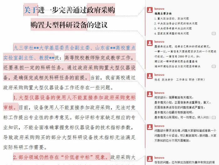 1.应围绕全国、全省经济社会发展全局,紧扣中央、省委重大部署举措,紧贴社会热点难点堵点问题,在调查研究的基础上,提出具体可行的建议。主要有: