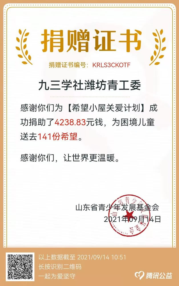 为深入学习贯彻潍坊市党史学习教育动员大会会议精神,扎实开展好“我为群众办实事”实践活动,在腾讯99公益日来临之际,九三学社潍坊市委青工委积极动员部署,组织广大青工委委员积极自愿参与公益捐款,支持山东省青少年发展基金会发起的“希望小屋”儿童关爱工公益项目,在9月7日-14日期间,共有66人次参与线上捐款,成功捐助了4238.83元。