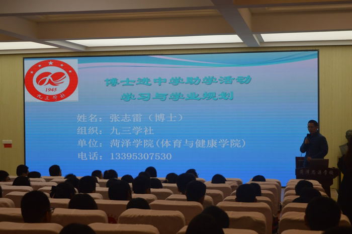 2021年11月28日下午,九三学社菏泽市委赴思源中学开展“博士助力学海泛舟”活动。社内博士、菏泽学院体育与健康学院副教授张志雷为学校200余名学生做了题为《学习与学业规划》的主题演讲,社菏泽市委副主委张传新等参加活动。