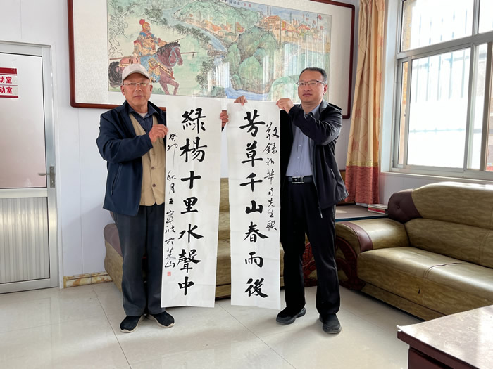 张桂德还代表九三学社烟台市委员会向胡城村村委赠送了九三学社中央书画院院务委员会委员、中国书法家协会会员王宁波的书法作品“芳草千山春雨后,绿杨十里水声中”。“芳草千山春雨后,绿杨十里水声中”是由初大告先生的大哥初芾南先生当年回村所提,描绘的是当时胡城村的景色。初芾南先生是清朝末科也就是最后一次科举考试的举人,后来担任过山东省政协委员、山东省文史馆员,他在初大告先生求学路上提供了引导和资助。