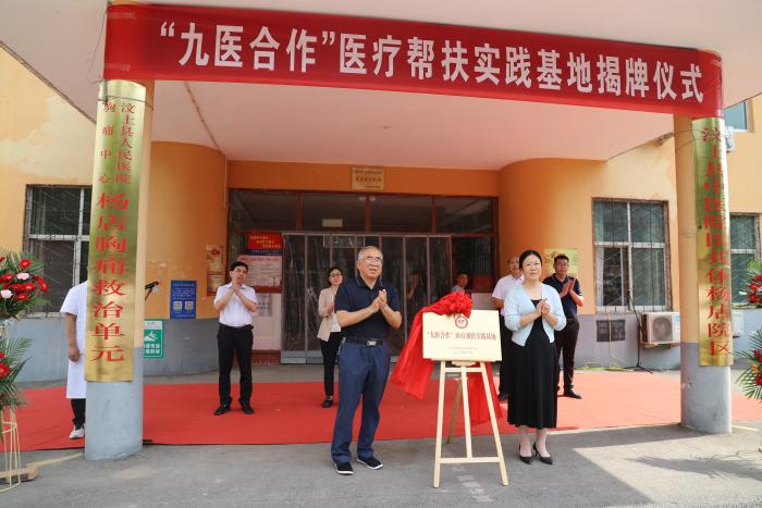社济宁市委会专职副主委刘要武,中共汶上县县委常委、宣传部部长、统战部部长周丽莎共同为“九医合作”医疗帮扶实践基地揭牌。