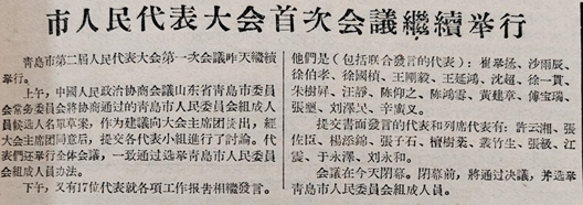 在1957年1月15日《青岛日报》第一版,刊登了社员张玺、陈鸿雪、傅宝瑞相继发言的消息。