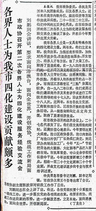 在1985年1月24日《青岛日报》第一版,刊登了各民主党派成员参加经验交流会的消息。