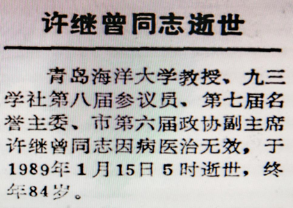在1989年1月17日《青岛日报》第三版,刊登了许继曾逝世的消息。