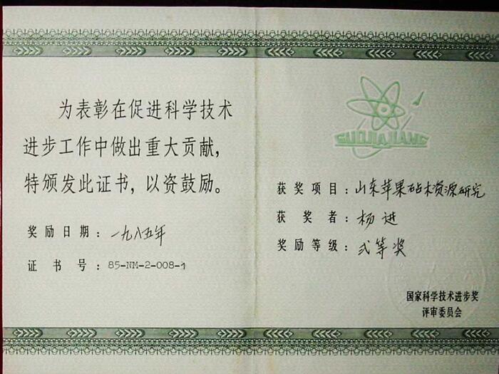 1985年10月8日,国家科技进步奖评审委员会召开第二次会议,评定核准科技进步奖1772项。青岛社员、青岛市农业科学研究所高级农艺师杨进,青岛社员、青岛市农业科学研究所农艺师章祖涵的“山东省苹果砧木资源研究”科研项目获1985年国家科学技术进步二等奖。