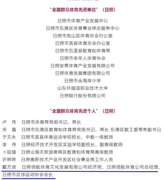 11月10日,国家体育总局发布了《体育总局关于表彰2021-2024年度全国群众体育先进单位和先进个人的决定》,授予3182个单位“全国群众体育先进单位”称号和2356人“全国群众体育先进个人”称号,日照市共有11个集体和7名个人上榜。其中,九三学社日照市第四支社委员,日照领航体育公司总经理、日照市足球运动协会会长戴方波荣获“全国群众体育先进个人”。