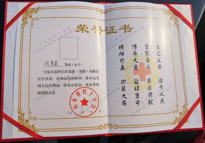 山东省红十字会颁发了代秀英把遗体(角膜)捐献给医学事业的荣誉证书。代秀英是潍坊市第二位捐献了遗体(角膜)的九三社员,她生前救死扶伤致力于临床医疗事业,身后捐出遗体(角膜)助力医学研究,其情怀与精神感人,令人敬佩。(社潍坊市委王兴全)