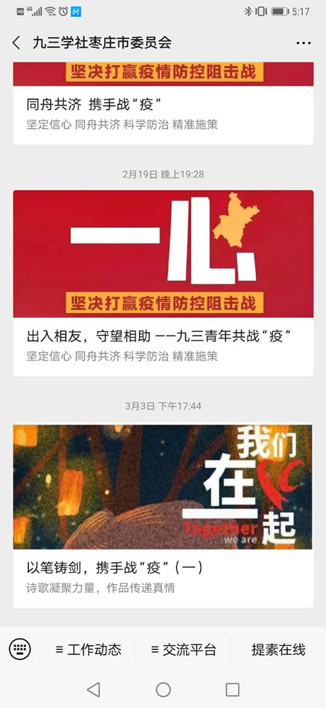 有这样一些枣庄九三人,他们虽不能战斗在抗击疫情的第一线,却积极围绕疫情防控建言献策,为打赢这场疫情防控阻击战出谋划策。自抗击疫情战役打响后,全市社员报送社情民意信息近70篇,社员丁志坚、杨效娟等提交的《做好舆情管控,避免过度炒作,积极应对新型冠状病毒感染肺炎疫情的建议》《危中之机,建筑业迎来新挑战、新机遇》,社员陈荣辉提交的《基层村居联防联控排查中存在问题的建议》等多篇信息充分体现着枣庄九三人的担当使命、家国情怀。