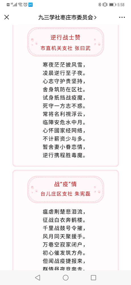 其中,有社市委老主委张曰武的《逆行战士赞》:“寒夜茫茫披风雪,凌晨逆行至子夜。心志守护贵坚持,舍身筑防在区社。试身扺挡战疫魔,死守一方志不惑。常将名利視浮云,临陣安危水中月。心怀國家经网络,不计薪资少与多。暂舍妻小眷恋情,逆行携程胜毒魔。”有社员朱宪磊的《战“疫”情》:“瘟虐荆楚悲泪流,征战白衣奔鹤楼。千里战鼓号令摧,风月同天聚援手。”等等;社市委青工委创作了几十幅“日签”图文作品,通过搜集温暖和激励人们心灵的名人名言、社科知识等,形成分享座右铭和人生感悟的窗口,为武汉加油,为平安祈福,为抗疫贡献智慧和力量;社员赵存兰原创作词歌曲《致敬逆行者》发表在《学习强国》,表达了对抗疫一线的逆行者们最崇高的敬意和深深的祝福;社员张伟广泛收集我省九三社员抗击疫情的资料,撰写了多篇连载文章《前进九三,情满庚子》《以青春之我担战“疫”之责(上中下)》在社省委、社中央的网站及公众号发表。