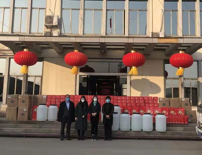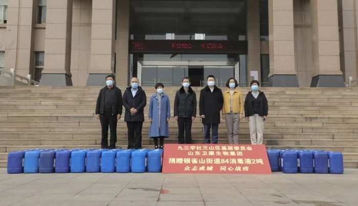2月11日,兰山区基层委员会联合山东卫康生物集团向银雀山街道捐赠84消毒液2吨。