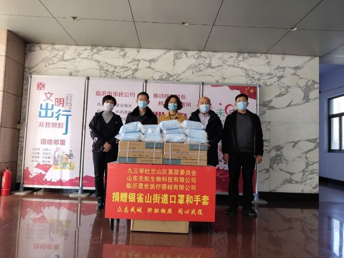 2月18日,九三学社兰山区基层委员会联合山东先航生物科技有限公司、临沂晟世医疗器械有限公司向银雀山街道捐赠了2000个医用口罩和20000只一次性手套。