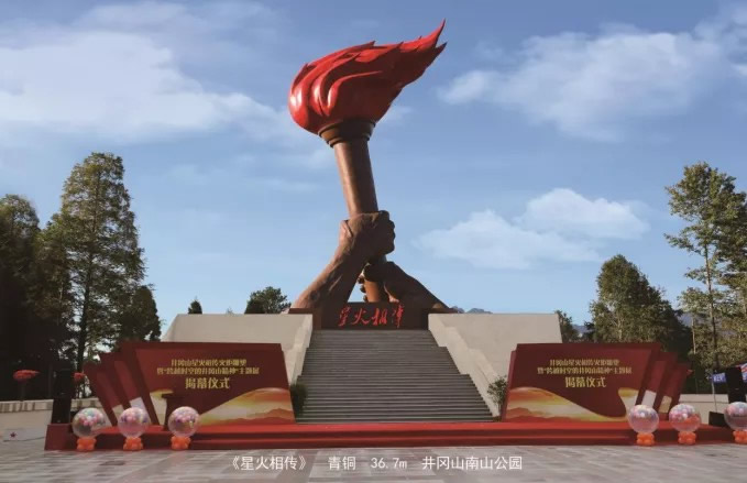 值得一提的是:2017年4月,江西省吉安市井冈山茨坪南山公园升级改造工程,将把南山景区建设为以“传承红色基因,继承井冈山精神”为主题的游览景区。在南山景区山顶新建“火炬广场”,广场内建设一占地1400平方米的“弘扬跨越时空的井冈山精神主题展览馆”。展馆以“传承”为主题,大力弘扬井冈山精神。火炬广场周边耸立着89个小火炬,其中主火炬高达34米,寓意着毛泽东同志在34岁时带领工农红军上井冈山,主火炬底座高2.7米,标志着井冈山革命根据地在1927年创立,广场火炬共90个,寓意井冈山革命根据地创立九十周年。该工程属中宣部督导工程,江西省委宣传部和吉安市委领导亲自挂帅,时间紧,任务重,质量要求高,政治意义重大。在不到四个月的时间里,完成如此艰巨的工程任务,困难确实不少,加之井冈山当时的天气正处于梅雨季节,几乎天天下雨,我亲自带队与华艺师傅们发扬井冈山精神,不怕苦,不怕累,夜以继日,连续作战,按时按质完成了此项光荣而艰巨的任务。2019年9月29日上午,南山火炬广场上彩旗飘扬,歌声嘹亮,江西省委常委、宣传部部长赵力平及吉安市有关领导出席“跨越时空的井冈山精神主题”开幕式暨南山火炬广场改造提升工程隆重竣工仪式。耸立云端的巨大火炬雕塑,在蓝天碧空中熠熠生辉,闪耀着不朽的井冈山精神。在此工作期间,我参观了井冈山革命摇篮纪念馆及红色古迹,去过黄洋界,拜访过茨坪毛泽东故居等革命遗迹。井冈山革命根据地的光辉事迹,时常在脑海中浮现。所以,创作《井冈山会师》这一主题,心中比较有底了。
