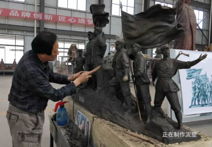 《井冈山会师》设计图稿确定后,随即开始了紧张而有序工作,从绞泥备料,喷水醒泥,然后马不停蹄地制作造型骨架及细铁丝缠绕,上第一层大泥覆盖雕塑骨架,同时用木槌补平泥间空隙,待全部上泥后,不断调整完善人物及整体造型,直至做到精准无误。在这一过程中,要不断的喷水,保持泥塑的湿度,以免裂缝。作为一个雕塑作者,在制作雕塑特别是从事重大历史题材作品的创作时,不仅要深入学习、认真思考和精心制作,更要有耐心,还要耐得住寂寞。有的人说:“苦,并快乐着”。我就有这样的感受。时间一天天过去,作品每天都有新的改观和变化,人物造型也逐渐丰富起来。经过对作品不断地修补完善细节后,用泥塑刀对作品进行认真地整体压实或留有塑痕,使整体效果更加统一协调。