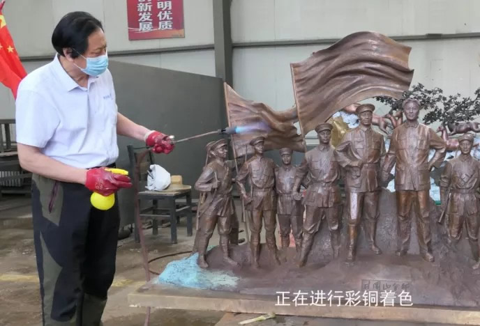 《井冈山会师》泥塑完成后, 进行精心细致的硅胶翻模,因泥塑造型复杂,根据铸造要求,进行合理的分块翻制。每块硅胶模型制好后,经过清洗,待干后进行蜡模灌制,尔后对蜡型人物一丝不苟的修补,达到栩栩如生。继而浇口设计和硅溶胶工艺制壳,将设计好浇注系统后的蜡型表面涂抹硅溶胶浆料和耐火材料,每涂抹一层要在恒温恒湿的风干室内进行风干4-8小时,反复涂抹多层才能达到所需要的厚度和强度。再进行蒸汽脱蜡工序,脱蜡是指将制好的硅溶胶型壳加热脱除蜡型的过程,采用蒸汽脱蜡釜进行脱蜡,蜡型去除的空间即为浇注铜水的空间。然后焙烧铸造,将脱蜡后的型壳放在焙烧炉内进行焙烧,温度达到1000℃-1200℃即可。因锡青铜浇铸温度为1250℃,当型壳和铜水达到铸造温度时应迅速进行浇注。再一道工序是清砂精修,清砂是采用高压水枪清理浇注完成冷却后去除硅溶胶型壳的过程。精修打磨分为粗磨、细磨、精磨三步,通过对铸件反复精修打磨,使之达到完美效果。最后表面着色,雕塑采用了先进的化学热着色彩铜工艺,在铜雕表面上喷洒化学试剂,通过加热氧化后产生丰富的色彩效果。上色完成后进行打蜡或氟碳漆保护,使其与空气隔绝,防止铜雕氧化变色。经过这一系列细致、复杂的工序后,一件完整的作品终于诞生了。