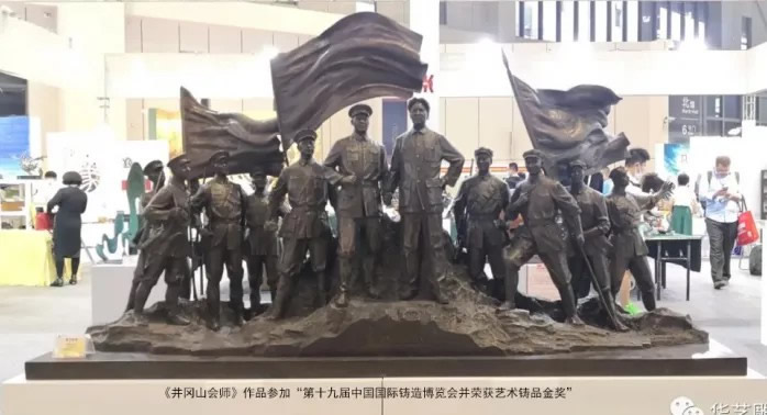 《井冈山会师》雕塑作品于2021年5月20日竣工完成,其中雕塑底座长2021mm,寓意2021年而作,雕塑高为100cm,代表中国共产党成立100周年。于2021年5月26日参加了在上海国家会展中心举办的“第十九届中国国际铸造博览会并荣获艺术铸品金奖”;5月28日在山东济南舜耕国际会展中心“2021第十三届中国(山东)工艺美术博览会“壮丽百年·薪火相传”庆祝中国共产党成立一百周年山东工艺美术大师精品创作主题展中”荣获二等奖,同时于6月21日在山东省社会主义学院展出。值此建党百年之际,中国国际进口博览局、国家会展中心(上海)共同举办的“百年风华、进博文脉——2021进博文化周”于7月3日至6日盛大开启,《井冈山会师》作品应邀参加展览。精湛的青铜技艺,恢弘而传神的艺术造型,得到嘉宾和观众的高度赞誉。