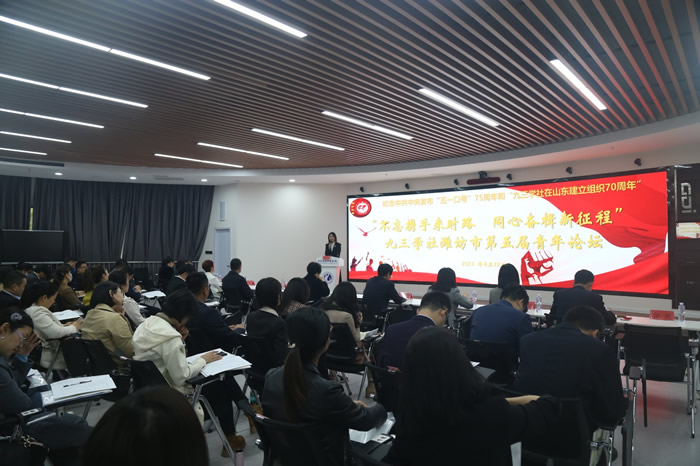 4月28日,九三学社潍坊市委会第二届青年工作委员会第一次会议暨纪念中共中央发布“五一口号”75周年青年论坛举办。九三学社潍坊市委会主委于冬菊出席,社市委会副主委、青工委主任赵同祥出席并讲话,社市委会副主委王建良主持,秘书长岳建利出席,社市委青工委副主任、委员等87人参加。