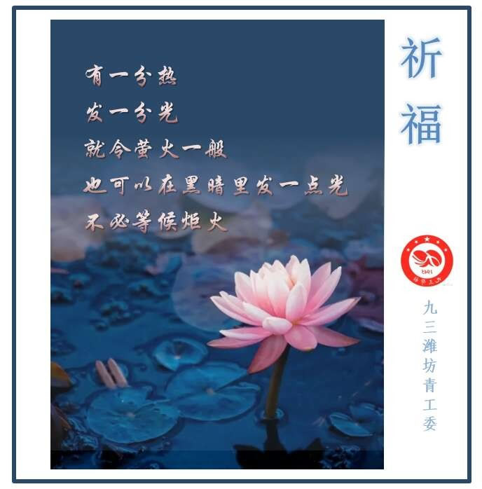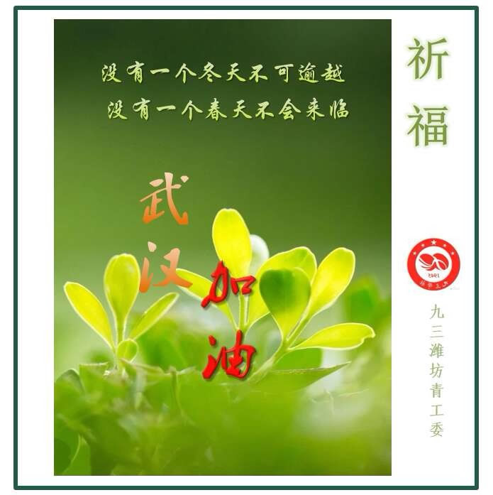 新型冠状病毒肺炎疫情的防控,牵动着每个中华儿女的心。总有一种善良温暖身体,总有一种无私感动心灵。在这段应对疫情的特殊时期,九三学社潍坊青工委响应社市委号召,积极发动青年社员,围绕抗疫主题,创作一批“日签”图文作品,通过搜集温暖和激励人们心灵的名人名言、社科知识等,形成分享座右铭和人生感悟的窗口,为武汉加油,为平安祈福,为抗疫贡献智慧和力量。截止目前,已累计创作日签作品10多篇,由青工委副主任岳连红、冯君妍,委员马云云、沈法鹏、文居亭、杨淼淼、周雪梅参与创作。我们坚信:草木萌发,春山可望,并肩战斗,所有的努力都不辜负,所有的坚守都会奔向团圆。(社潍坊市委 孙三鹏)