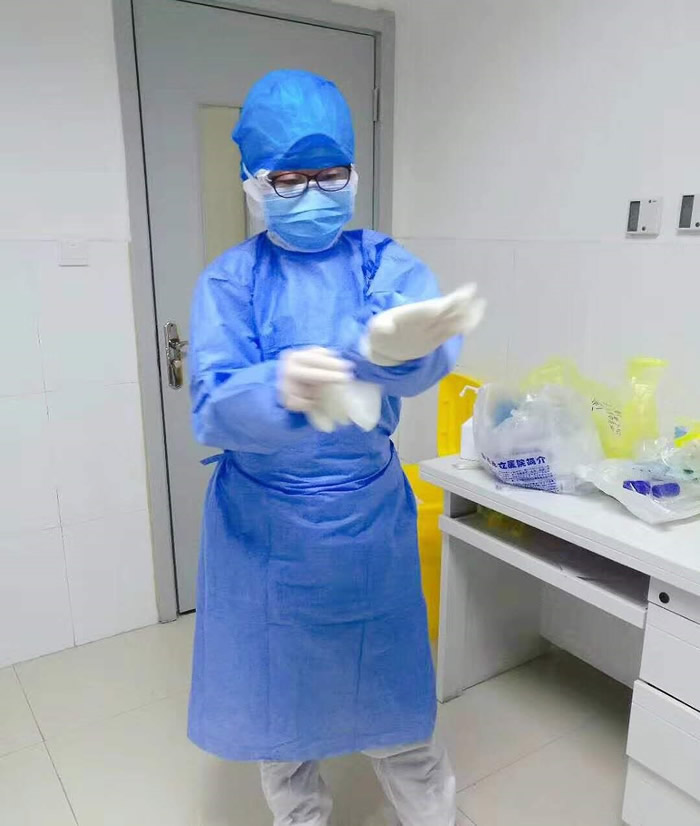 (孙鲁静穿防护服,准备进入病房) 菏泽市第一位患者袁某刚入院的时候心理压力较大,害怕病治不好,非常消极悲观,躺在病床上不愿动,连饭都吃不下去。孙鲁静了解到他的情况,每天除了询问患者病情变化,还陪他谈心,做好心理疏导,鼓励患者增强信心,告诉他病情比较轻,在入院期间,病情已经得到了很好的控制,只要保持乐观的心态,配合医生的治疗,就会很快康复。经过几天的耐心劝解和安慰,患者渐渐从焦虑、紧张、悲观的心境中走出来,积极配合医生的治疗。在后面几天,他还能在病房里适当运动,帮助恢复体力。他说:“医生的鼓励给了我信心,这个肺炎也不是不能治愈的病,只要好好治疗,坚定信心,就能康复。”