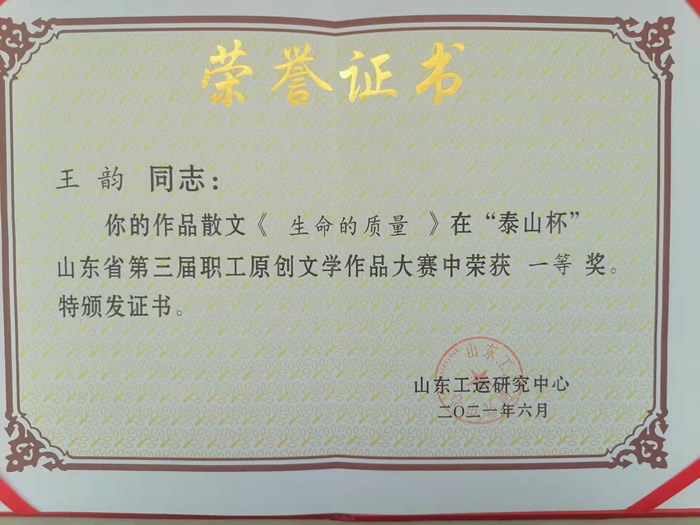 此外,王韵的散文《生命的质量》在“泰山杯”山东省第三届职工原创文学作品大赛中荣获一等奖。(九三学社烟台市委员会机关 组宣科科长 仲晓宁)