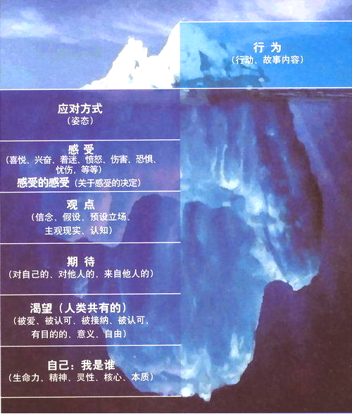 人类具有社会属性,我们在茫茫人海中生活,犹如在大海中航行,也会遭遇冰山。人海中的“冰山”同样也是令人生畏的,比如在工作中难免会遇到一些障碍,我们是逃避,还是化解?可能很多人想到躲避,但是最终会发现无处可躲。因为我们肩负的工作责任,需要我们化解障碍、完成任务。那么具体该怎么办呢?在实践中,我们发现运用心理学中的“冰山理论”可以有效化解工作“危机”。 早在1895年,心理学家弗洛伊德就提出了“冰山理论”,他认为人就像浮在海面上的冰山一样,我们所能看到的只是表面的部分“行为”,而更大的内在世界却藏在海面以下,不为人所见。海面以下的部分包括:“应对方式、感受、观点、期待、渴望、自我”七个层次,见下图。