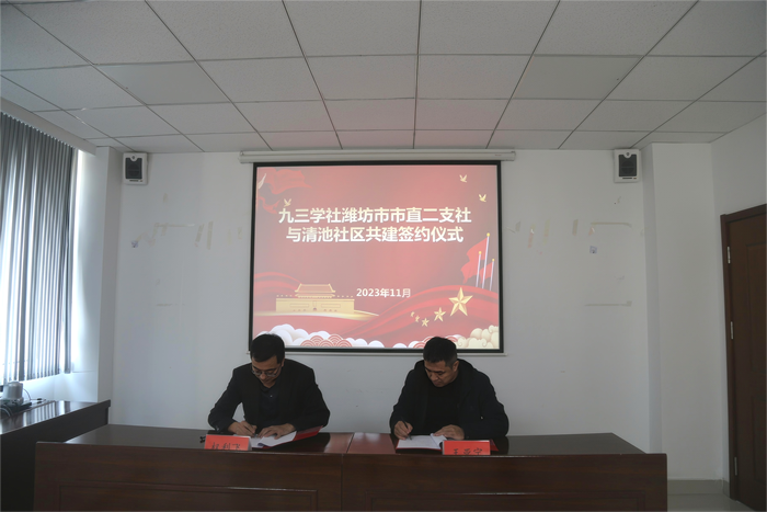 社市直二支社主委权利飞和清池社区党委书记王亚宁代表双方签订“结对共建协议书”。