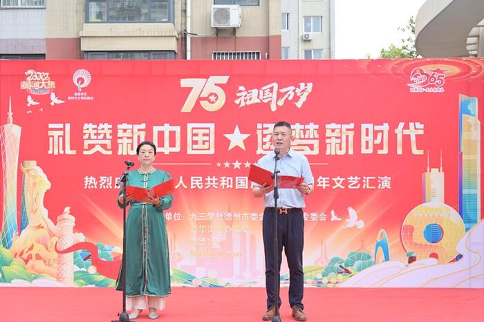 为庆祝新中国成立75周年,9月28日,九三学社德州市委会文化艺术专委会联合德城区新华街道办事处、益德社区举办迎国庆文艺汇演活动。社市委会文化艺术专委会主任梁丽霞、宣传工委会主任薛莲,新华街道办事处副主任蔡世强等街道、社区领导参加。