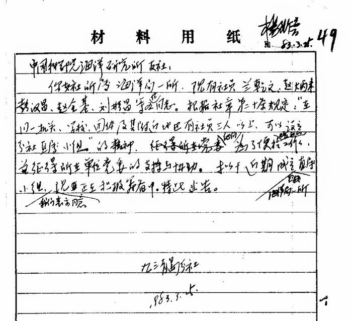 1983年3月25日,九三学社青岛分社给中国科学院海洋研究所支社印发通知,决定成立九三学社青岛分社国家海洋局第一海洋研究所直属小组(现九三学社自然资源部第一海洋研究所委员会),蓝乾文为直属小组负责人。直属小组成立时社员名单:蓝乾文、赵炳来、彭汉昌、赵全基、刘彬昌。虽然在其他档案中没有找到直属小组召开成立会议的信息,但从这份档案中,可以看出文末虽然没有青岛分社的公章,但有时任青岛分社秘书长杨衍普的签字,从而可以确定3月25日是九三学社自然资源部第一海洋研究所委员会的创建日。