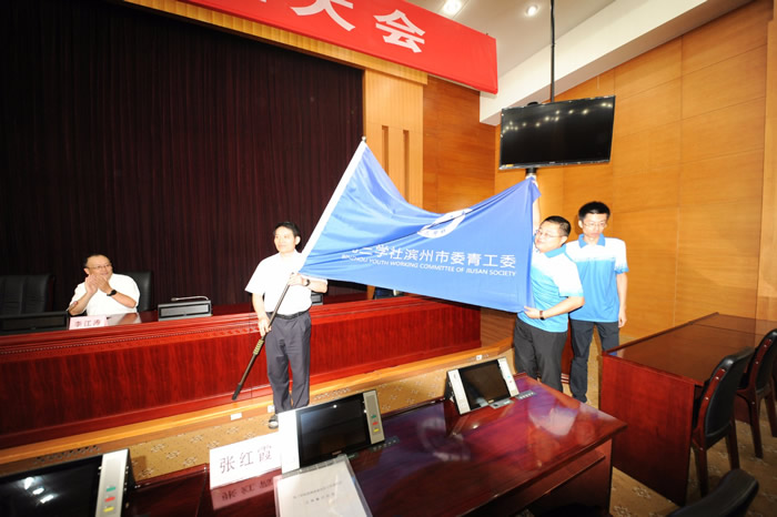 社省委组织部部长、一级调研员、青工委副主任孙钢为新成立的社滨州市委青工委授旗。