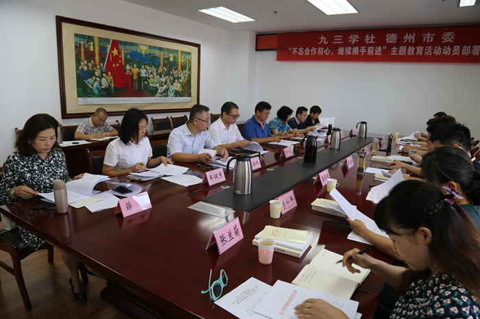 为组织开展好“不忘合作初心,继续携手前进”主题教育活动,社德州市委成立了主题教育活动领导小组,社市委主委钟玲任组长,分管思想宣传工作的副主委张兰菊任副组长,社市委副主委田正祥、李和平、郭天德和秘书长戴连强为领导小组成员。领导小组下设办公室,办公室设在社市委机关,秘书长戴连强任办公室主任,机关人员参加办公室工作,负责主题教育活动日常工作。 中共德州市纪委监委派驻第七纪检监察组组长王文远、中共德州市委统战部副部长于清泉应邀参加会议。(九三学社德州市委 关燕) |