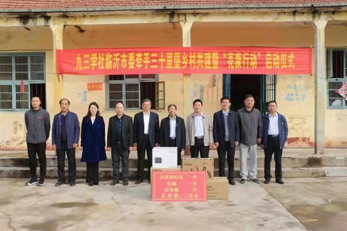 11月13日上午,九三学社临沂市委牵手沂水县四十里堡镇三十里堡村结对共建暨“亮康行动”启动。中共临沂市委统战部副部长王子鹤,社临沂市委副主委孙敬忠,秘书长庞丽萍,市直五支社主委、鲁南眼科医院院长高富军出席本次活动。 高富军代表社市委向该村捐赠全科诊疗仪、电脑、打印机等物品,价值共计3万余元。鲁南眼科医院“亮康行动”医疗小组的专家还为群众进行眼病各项检查,耐心讲解眼部疾病的预防和治疗,让基层群众足不出户,就能享受到先进的专家团队诊疗。当天义诊眼病患者200余人。 沂水县委统战部常务副部长刘敦军、副部长赵富东,工商联副主席鞠太明,四十里堡镇镇长高虎泉等相关工作人员陪同。(九三学社临沂市委 郑茗月)
