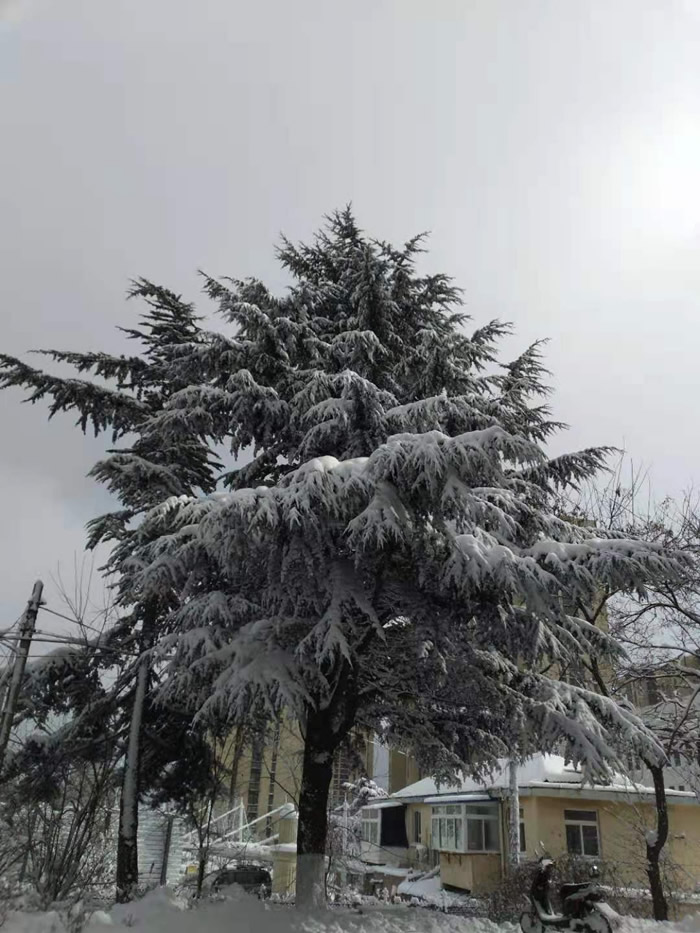 青松覆雪彰高洁,纤枝蔓白宛琼花。