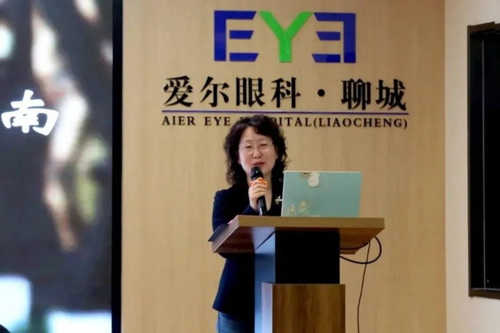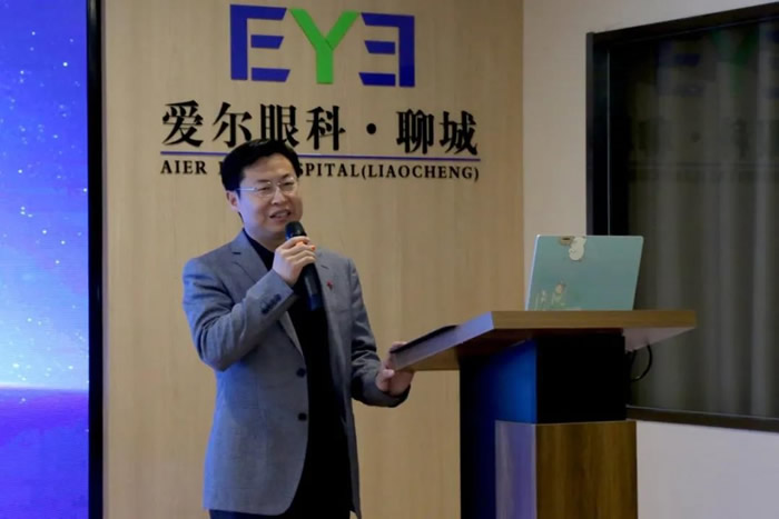▲九三学社聊城市社员,聊城市爱尔眼科医院眼底病专家李忠庆院长授课
