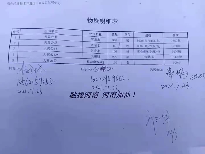 一方有难八方支援,此次河南灾情更是牵动着天翼每位成员的心,大伙积极捐款捐物 。截止7月23捐日收到捐款的金额27772元;收到捐赠物资矿泉水12000瓶,方便面2000箱,火腿肠205箱,充电宝100的个。