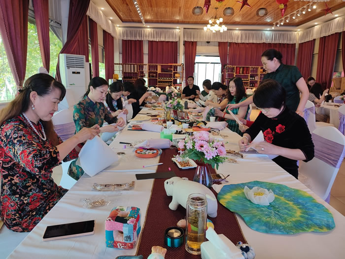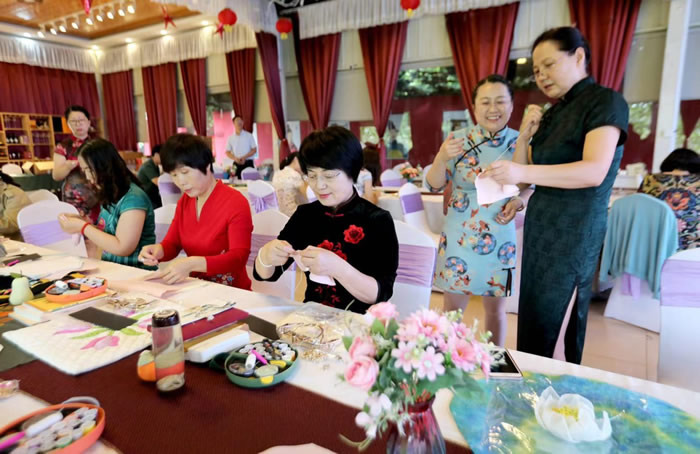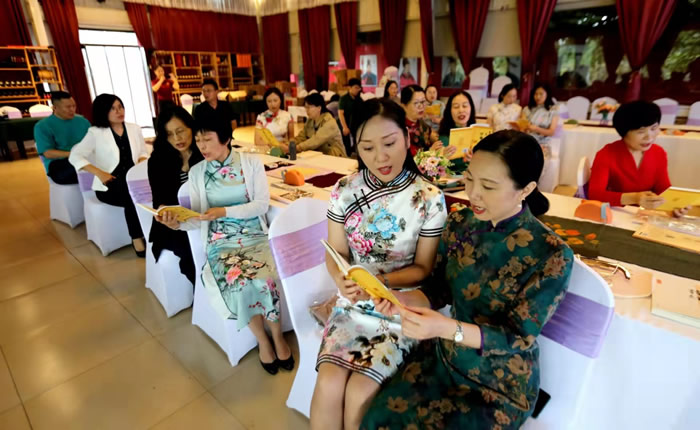 活动现场,朗朗诵读传唱经典,旗袍佳人笑逐颜开。社员们先诵读了《诗经》《论语》《大学》等国学经典,品读传统文化,然后身着旗袍拿起针线制作绣囊,尽显贤淑气质。